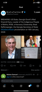 On January 16, 2026, Georgia Secretary of State Brad Raffensperger signed a proclamation designating Nnamdi Kanu as an Outstanding Citizen and “Goodwill Ambassador” from Georgia.