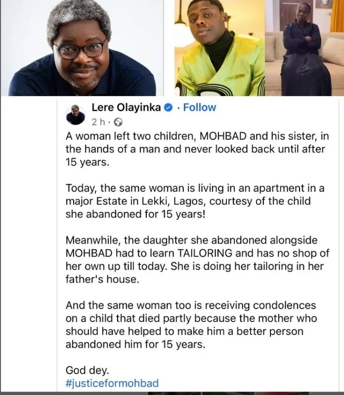 Singer’s Mom Lere Olayinka, the media aide to former Ekiti State Governor Ayodele Fayose, has taken to social media to condemn the mother of late singer Ilerioluwa Aloba, aka MohBad.